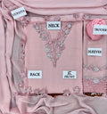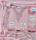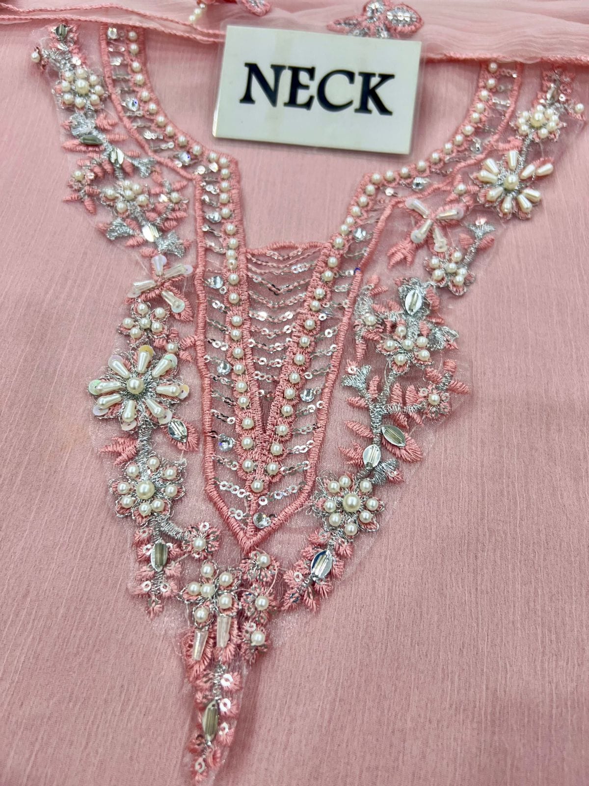 Front: Dyed chiffon front adorned with elegant embroidered neck patches, beautifully enhanced with heavy adda work for a luxurious finish.