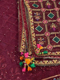 The front is fully embroidered with flawless finishing, while the daman is enhanced with heavy zari and sequin embroidered borders and chaank motifs, creating depth and richness. The back is crafted from dyed organza, maintaining a graceful flow, and the sleeves feature zari embroidery with attached borders, completing the luxury aesthetic.