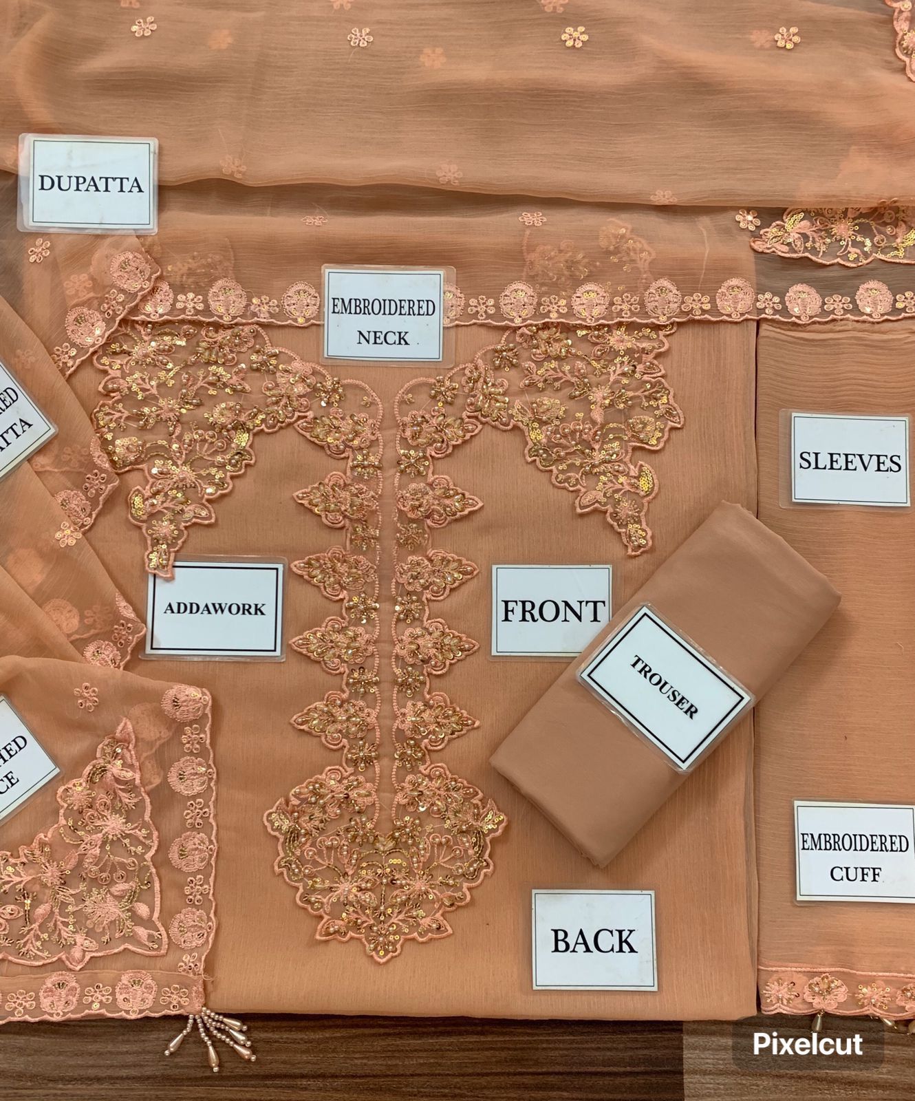 The crinkle chiffon front features heavy alternating embroidery with a long embellished neckline adorned with hand adda work, adding a luxurious charm to the outfit. The dyed chiffon back complements the front’s rich design, maintaining a graceful flow.