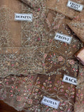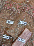 The net frock flows beautifully with intricate embroidery across its panels, while the jamawar trouser complements the design with rich texture and comfort. Every inch of this ensemble speaks of craftsmanship and refinement ideal for those who love traditional charm with a modern edge.
