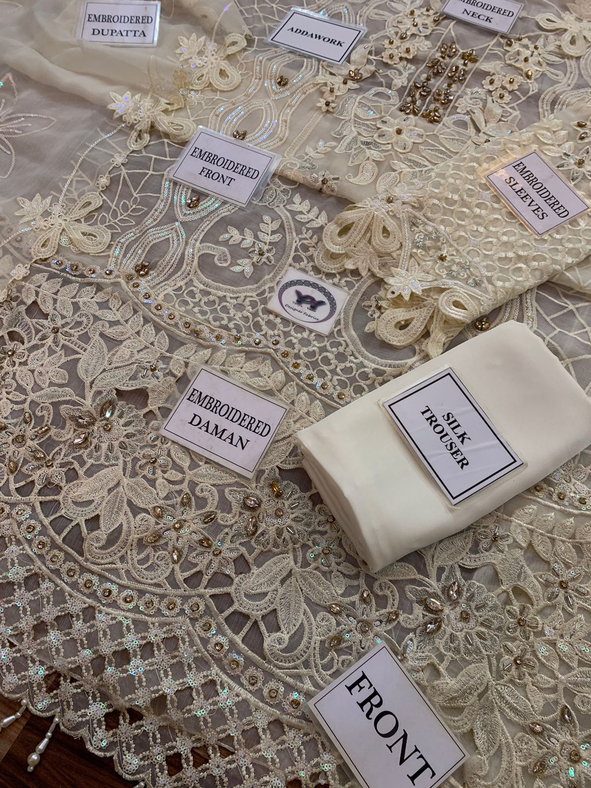 Completing the set, the embroidered chiffon dupatta comes with an attached pallu, offering both elegance and ease of styling. The dyed charmous trouser adds smooth texture and comfort, making it the perfect match for the heavily adorned top.
